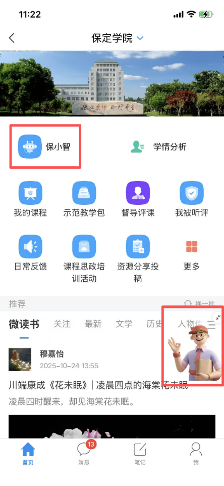 2.在保定学院页面中点击“保小智”-“网络信息管理中心”(见图2、图3),或直接点击图2红框中人物,进入AI对话。