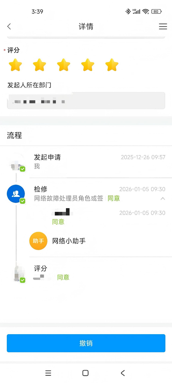 4.网络信息管理中心处理完毕后,流程进度会到报修人评分,评分完毕后,流程完成。