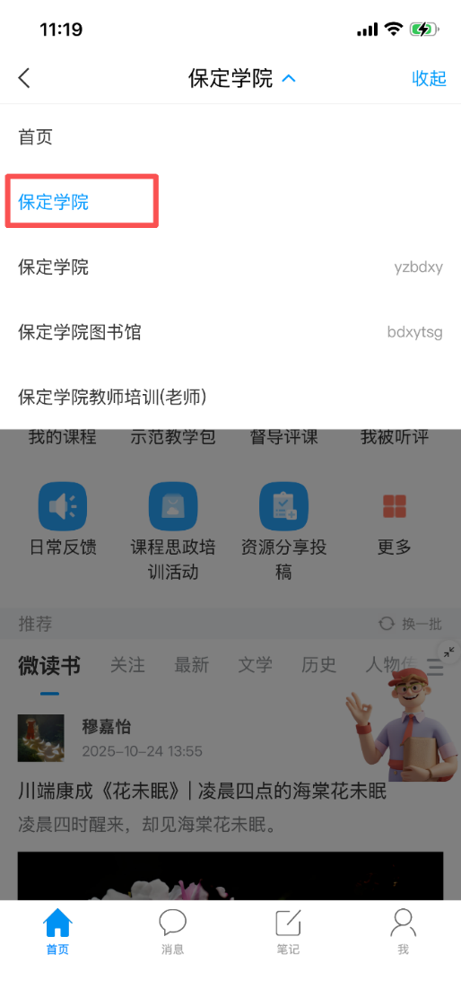 1.手机端登录学习通APP,选择保定学院页面,如图1。